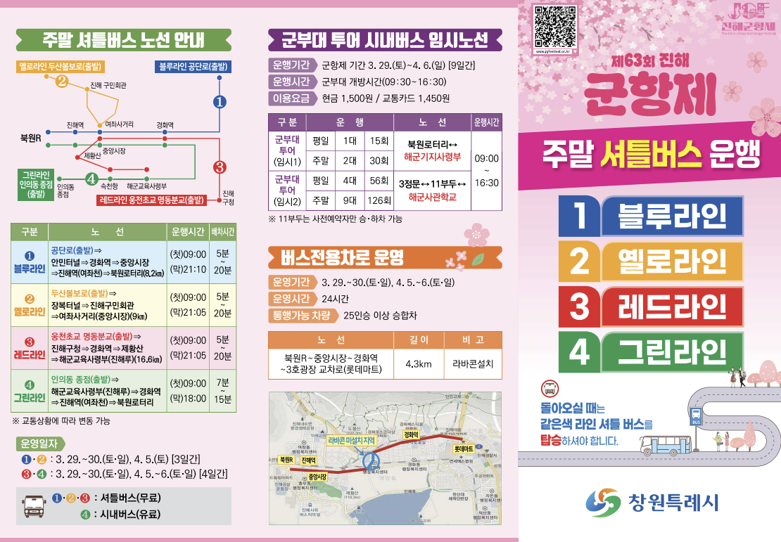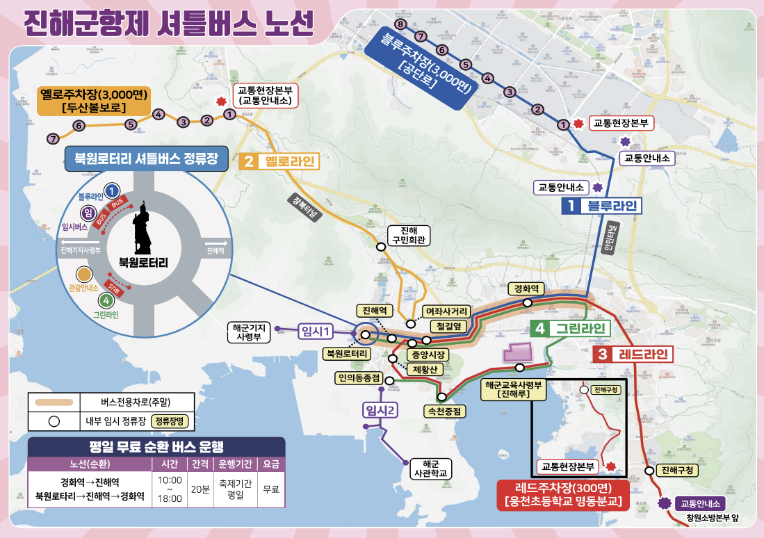- 블루라인: 공단로 주차장 → 경화역 → 중앙시장 → 진해역(여좌천) → 북원로터리